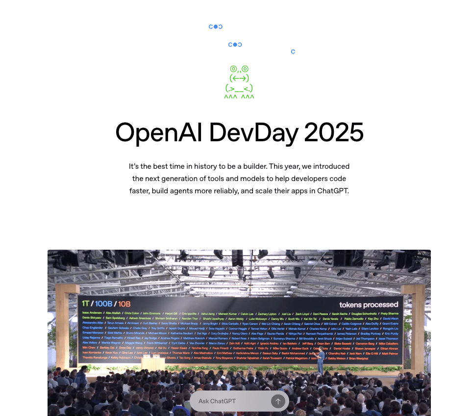 08 Oct 2025- OpenAI's DevDay unveiled Codex as an AI co‑worker, a no‑code Agent Builder, Apps SDK for interactive ChatGPT UIs, and new models (Sora 2, GPT‑5 Pro), accelerating agentic prototyping.